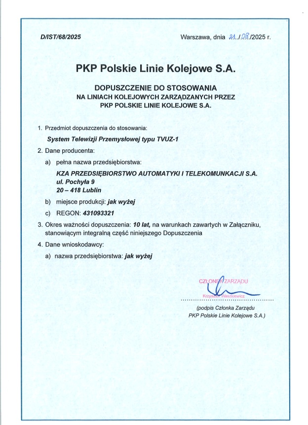 System telewizji przemysłowej typu TVUZ-1 produkcji KZA Lublin S.A. jest w pełni zgodny z instrukcją Ie-111 dotyczącą wymagań na systemy telewizji przemysłowej stosowane na przejazdach kolejowo – drogowych kategorii B, wprowadzoną Zarządzeniem Nr 36/2014 Zarządu PKP PLK S.A. z dnia 07.10.2014 r.